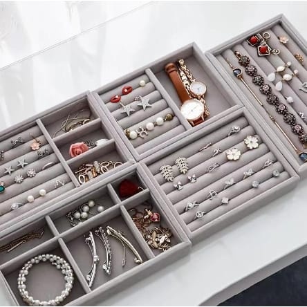 ✅ Proteção Premium: Revestimento interno e externo em veludo macio de alta qualidade (geralmente cinza claro ou bege), que protege suas joias de arranhões, poeira e danos. ✅ Design Modular Inteligente: O conjunto é composto por diferentes bandejas (módulos) que se encaixam e podem ser combinadas de várias maneiras para personalizar o layout da sua gaveta ou prateleira. ✅ Compartimentos Especializados: Inclui módulos variados para cada tipo de acessório:
